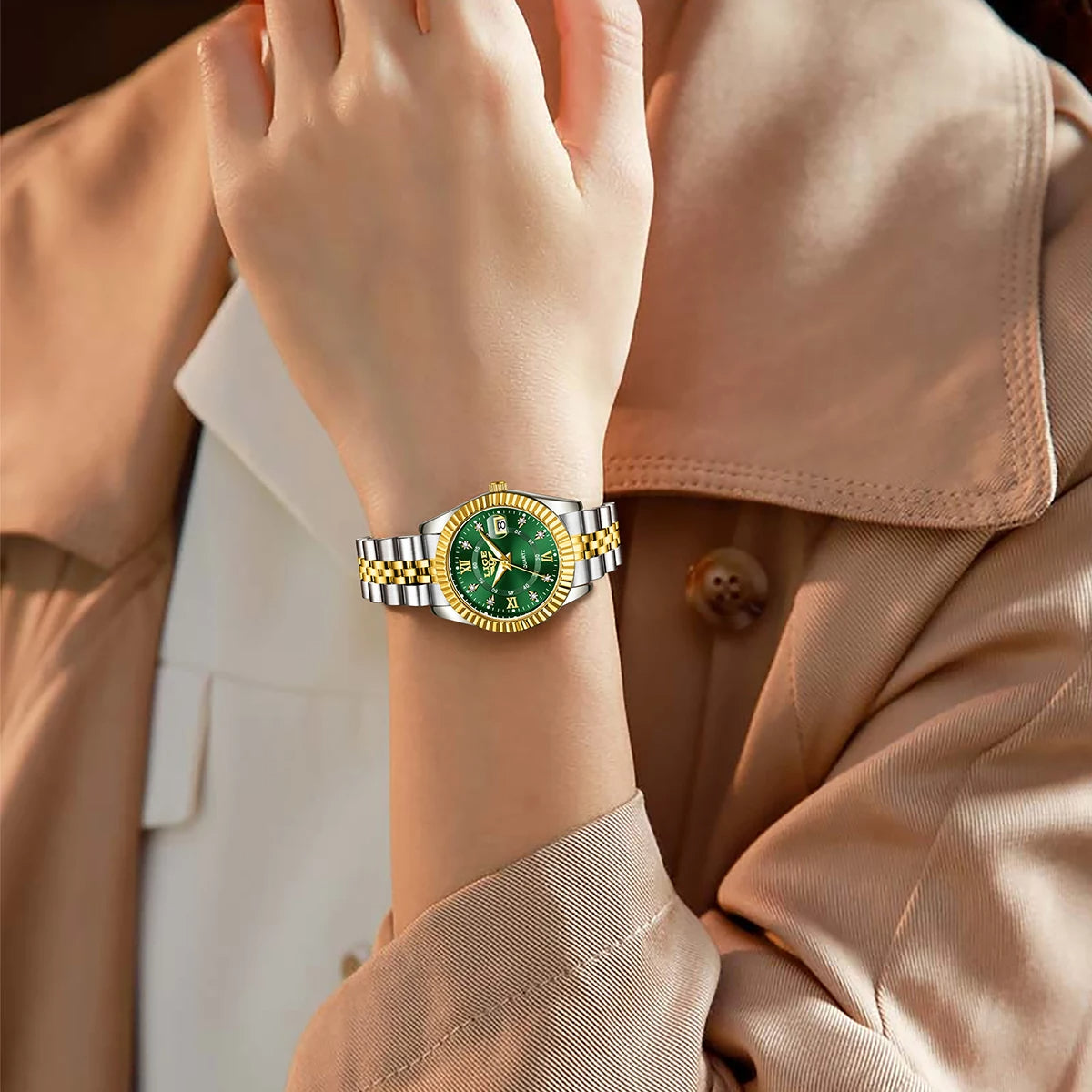 La LIGE Royale réunit une forme classique et un raffinement audacieux. Son cadran soleillé émeraude, sa lunette accentuée d'or et son bracelet en acier inoxydable bicolore capturent un équilibre parfait entre héritage et luxe moderne. Équipée d'un mouvement à quartz précis et dotée d'une couronne cannelée, elle est conçue pour ceux qui attirent l'attention par leur calme et leur style.