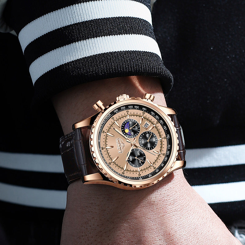 La Régence allie élégance traditionnelle et savoir-faire moderne. Son cadran en forme de soleil, son boîtier en or rose et ses sous-cadrans chronographes détaillés créent une apparence de sophistication raffinée. Fini avec un bracelet en cuir véritable, c'est une montre conçue pour ceux qui apprécient l'équilibre, la précision et un style intemporel.
